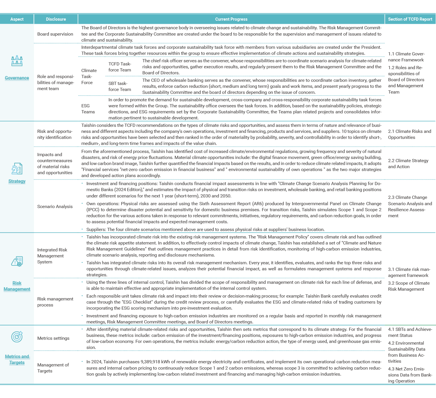 Taishin FHC became an official supporter of the Task Force on Climate-related Financial Disclosures (TCFD) in 2019. Taishin FHC disclose the company's climate related information according to the four TCFD thematic areas. Taishin FHC started independently compiling climate-related financial disclosure reports in 2023 for the purpose of helping stakeholders gain a better understanding of Taishin's measures for managing climate risks and opportunities. Please refer to the "Taishin FHC 2024 TCFD Report" for details of climate-related financial disclosures. The disclosures are summarized as follows: