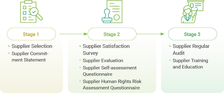 The general administration departments of the subsidiaries of Taishin FHC follow the Taishin FHC Supplier Management Regulations for better ESG supplier management. All suppliers who establish a purchasing relationship with the Company are required to sign a "Supplier Commitment Statement" at the time of contract signing. The signing rate has been 100% every year. The statement covers requirements in areas including corporate ethics and integrity, risk management, labor and human rights, social welfare, and environmental protection. It also provides the basis for monthly satisfaction surveys, annual supplier self assessment questionnaires, annual Supplier Human Rights Risk Assessment questionnaires, annual supplier assessment, and supplier conferences to be conducted afterwards to monitor and assess supplier performance.