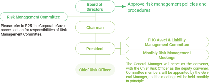 Taishin FHC has the Risk Management Committee to follow the "Taishin FHC Organization Rules of Risk Management Committee " and the committee members are appointed by the board of directors. The number of members shall not be less than three, and more than half of the members shall be independent