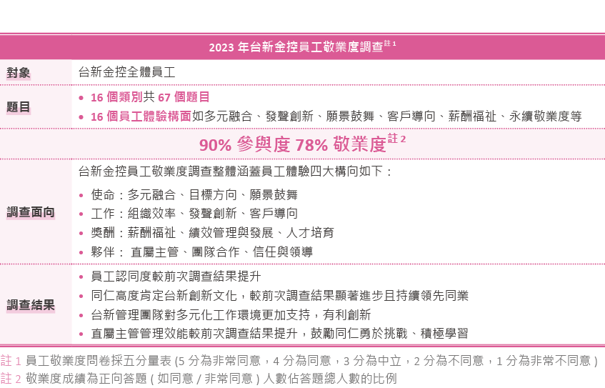 台新定期與外部專業顧問公司合作,期望透過全面的員工敬業度調查,了解員工對各項管理措施之看法、留才的關鍵因素及辨識優先改善的重要議題,進而提出具體行動計畫。台新每兩年執行一次所有員工的敬業度調查,近三次分別在2019年、2021與2023年執行,下一次預計於2025年進行調查;隔年則是依據組織需求針對不同事業群或特定族群進行調查。例如2020年是針對資訊服務處,2022年考量疫情外在環境影響暫緩調查,2024年則是台新人壽、金融市場事業總處,持續追蹤2023年意見調查改善行動方案,確保員工意見回饋後改善行動之落實。